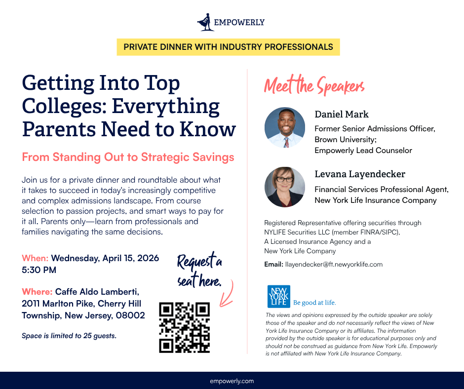 Join us for an exclusive evening hosted by New York Life Insurance in partnership with Empowerly on Wednesday, April 15 (5:30 PM ET) at Caffe Aldo Lamberti, Cherry Hill. A former Brown University admissions officer will facilitate roundtable discussions on what selective admissions actually look like today. Complimentary dinner included. Space is limited to 25 parents! Register here: https://hubs.li/Q048GHL50